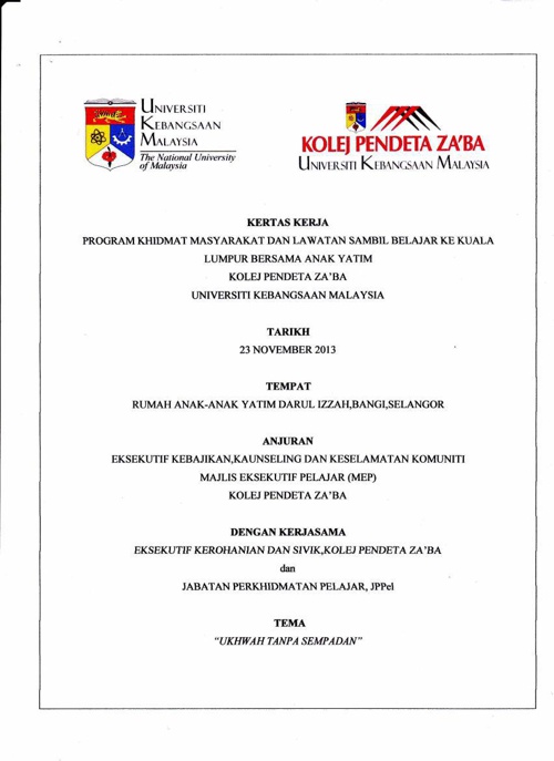 KERTAS KERJA CADANGAN BAGI PROGRAM KHIDMAT MASYARAKAT DI RUMAH ANAK-ANAK YATIM NURUL IHSAN SG SIPUT 10 TUJUAN Kertas kerja ini bertujuan untuk mendapatkan kelulusan Seminar dan Projek Pelajar untuk menganjurkan Program Loving is Caring bagi memenuhi syarat kerja kursus mata pelajaran Khidmat Masyarakat MPU 3412. Contoh Kertas Kerja Lawatan Ke Rumah Anak Yatim. KERTAS KERJA CADANGAN BAGI PROGRAM KHIDMAT MASYARAKAT DI RUMAH ANAK-ANAK YATIM NURUL IHSAN SG SIPUT 10 TUJUAN Kertas kerja ini bertujuan untuk mendapatkan kelulusan Seminar dan Projek Pelajar untuk menganjurkan Program Loving is Caring bagi memenuhi syarat kerja kursus mata pelajaran.